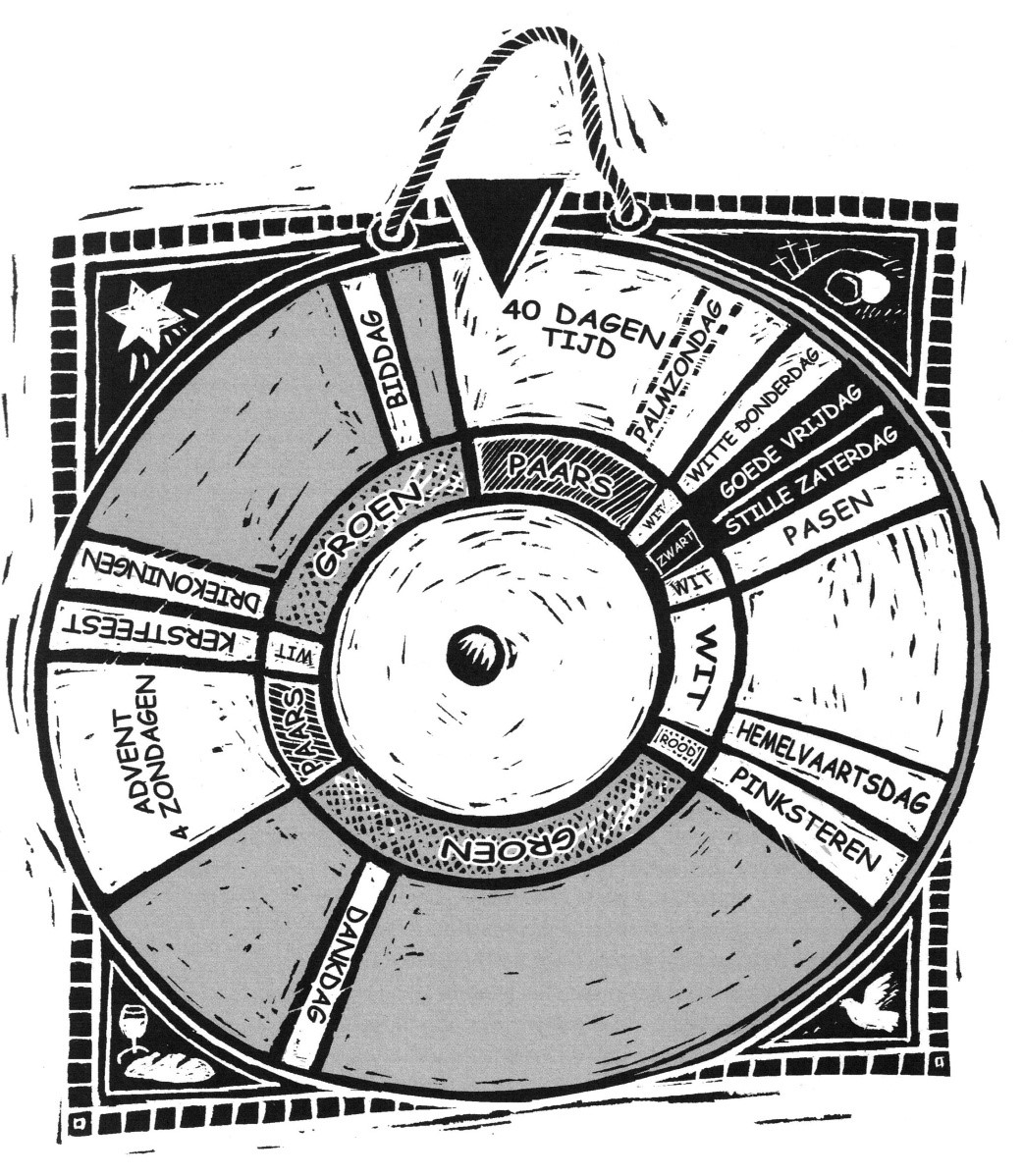 In ons kerkgebouw gebruiken we de kleuren van het kerkelijk jaar ( = een geordende opvolging van de feesten en de tijden die de kerk jaarlijks viert) in de vorm van linten aan de preekstoel. De kleuren zijn geen vrijblijvende versiering, maar duiden op de verschillende tijden in het jaar. Hiermee proberen we een bijdrage te leveren aan het bewust zijn van de gemeente om naar een feest o.i.d. toe te leven en het te vieren. Ook hopen we dat de lijn van de heilsfeiten zo zichtbaar wordt/blijft. Het gestructureerd gedenken van Gods daden wordt op deze manier vormgegeven.